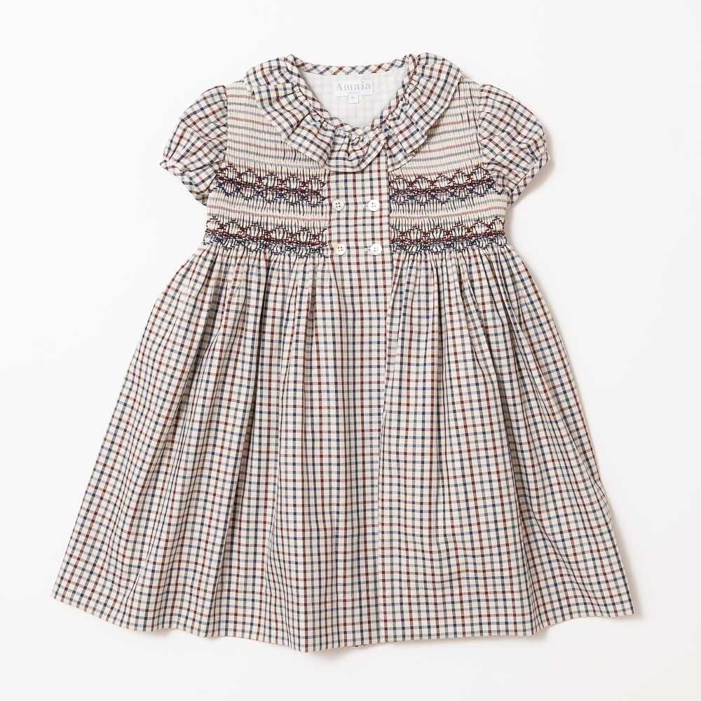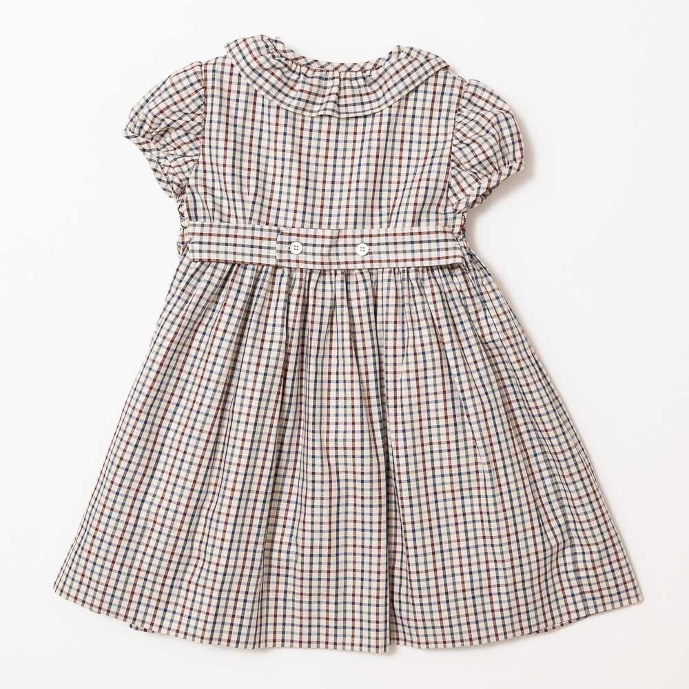 チェック柄のスモッキング刺繍入り半袖ワンピース。