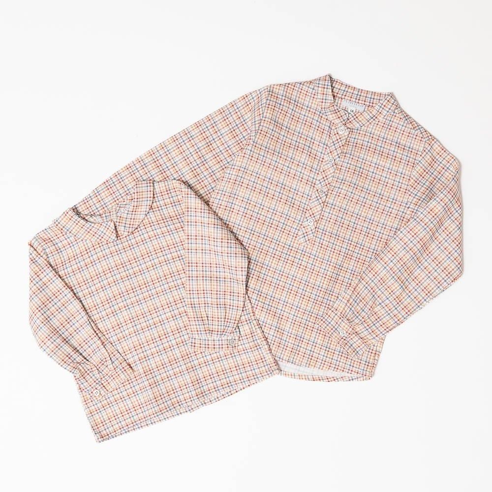 立ち襟が都会的な印象の長袖シャツは、クリーム地にライトブルー、キャメル、ブラウンがかったオレンジ色のチェックに、繊細なブラウンのペンシルラインが上品な雰囲気をプラスしています。