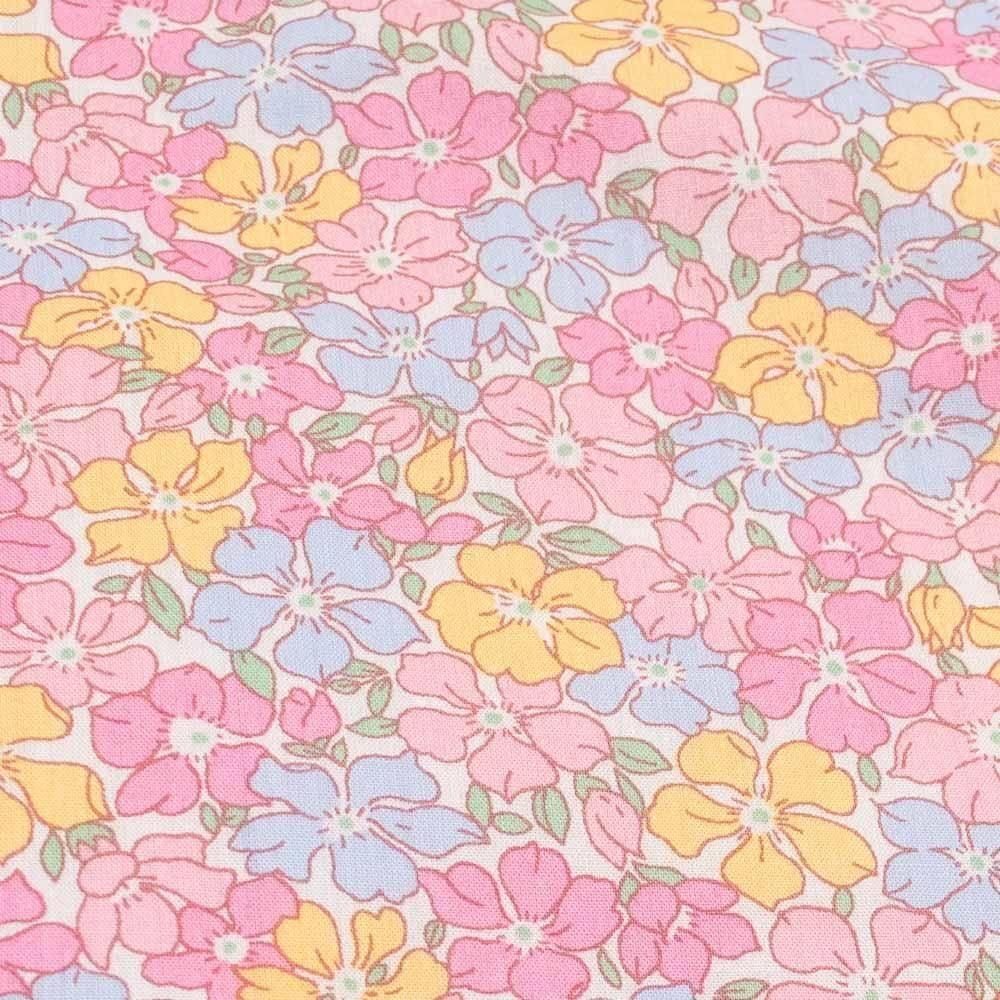 ベビーピンク、ベビーブルー、ベビーイエローのやわらかな色彩で描かれたお花とグリーンリーフが、淡く愛らしいデザイン。