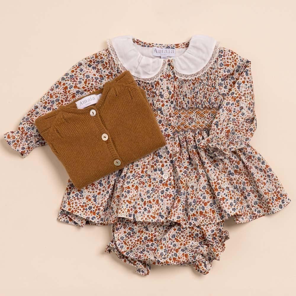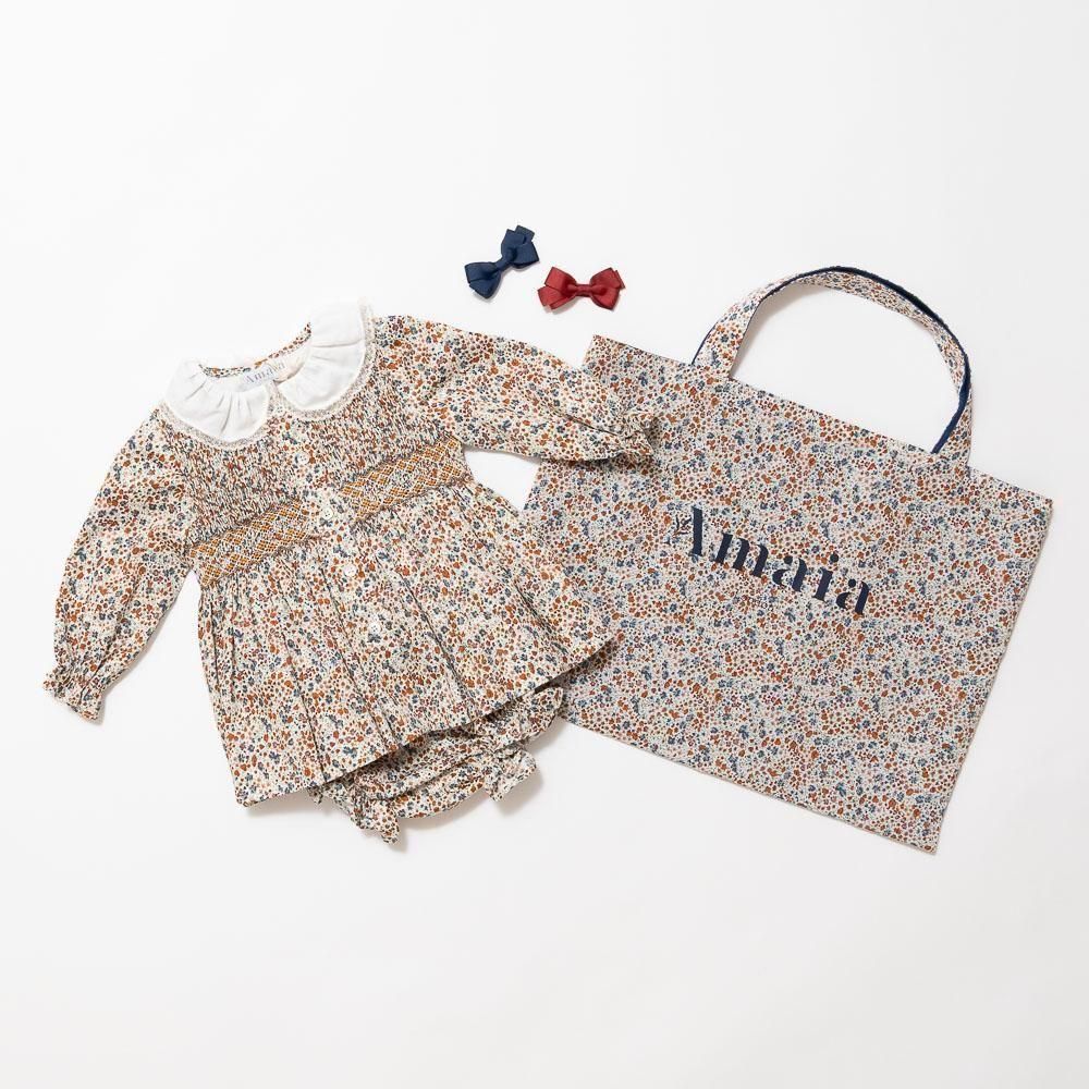 Amaia Kids別注、ツイルのリバティ生地を使用したスモッキング刺繍入りセットアップ。